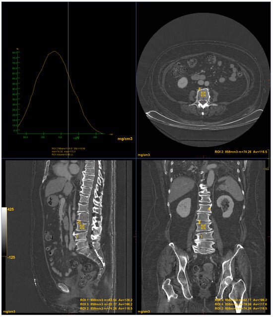 This retrospective opportunistic study included 51 postmenopausal female patients who underwent both DXA and dual-energy CT of the lumbar spine, abdomen, and pelvis in 2022–2023 for oncological follow-up or other clinical evaluation. According to the WHO, the study population was divided into three groups: osteoporotic (T-score is equal or less than −2.5), osteopenic (T-score between −1 and −2.5), and healthy patients (T-score more than −1).