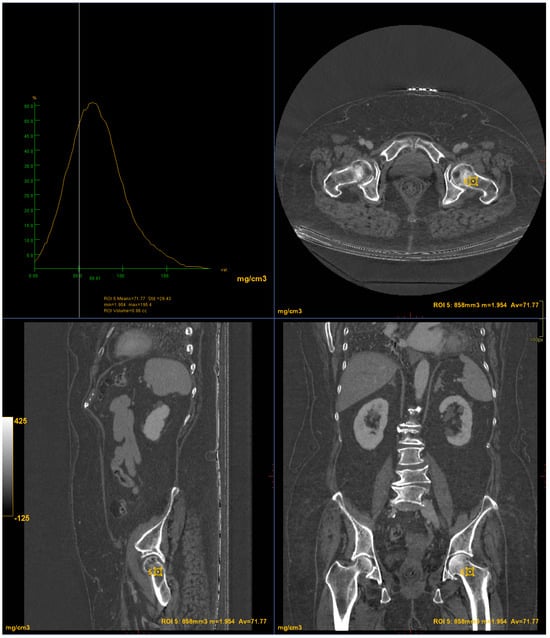 CT images were processed using AW3.2 software (GE Healthcare, Chicago, IL, USA) with a bone window and HAP–fat base material pairing, which highlights structures containing hydroxyapatite. Three-dimensional volume of interest (VOI) measurements were obtained at the lumbar vertebrae (Figure 3) and femoral neck (Figure 4), sampling the trabecular bone while excluding cortical bone regions.