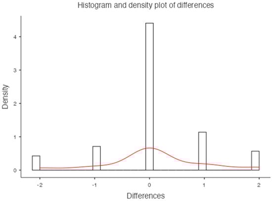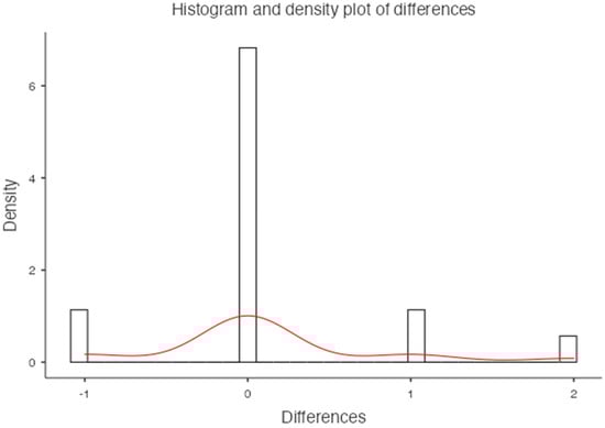 For the femoral neck, the mean BMD and T-score on DXA images were 0.522 g/cm2 and −2.92 for the osteoporosis group, 1.19 g/cm2 and −1.7 for the osteopenic group, and 1.98 g/cm2 and −0.68 for the normal group, respectively (Figure 7). There was a significant difference among the osteoporosis, osteopenic, and normal groups in BMD and T-score (all p < 0.001). The mean HAP value on DECT images was 74.71 mg/cm3 for the osteoporosis group, 107.57 mg/cm3 for the osteopenic group, and 121.93 mg/cm3 for the normal group (p < 0.001) (Table 3). Bland–Altman analysis revealed a bias of 0.11, with 95% limits of agreement from −1.2 to 1.4 (S.D. ± 0.6826; p = 0.2) (Figure 8).