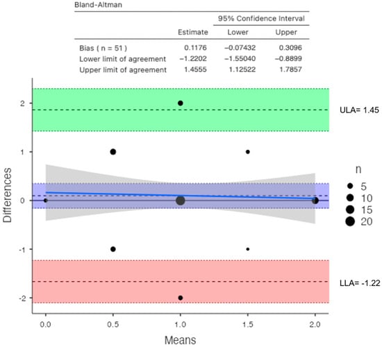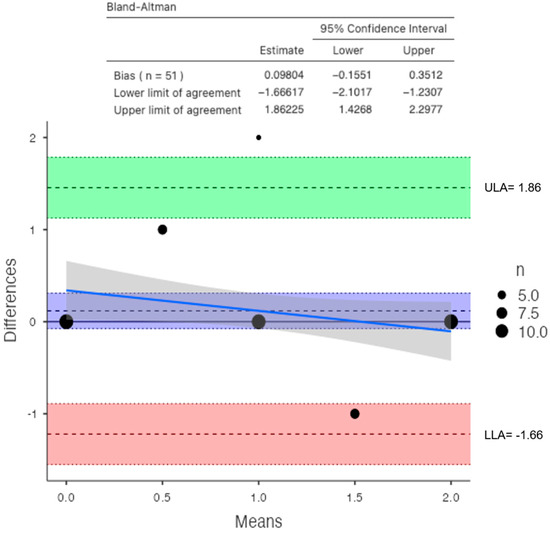 Bland–Altman plot between DXA and DECT HAP–fat measurements on the femoral neck (direction of subtraction for the Y axis—DXA minus DECT; blue line shows the performance bias of the method; ULA: Upper Limit of Agreement; LLA Lower Limit of Agreement).