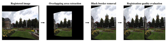 As ground truth registrations do not exist for the UDIS-D dataset, the current study evaluated the image registration quality based on the similarities between the overlapping areas of the target and source images, since perfect registrations should result in identical overlapping areas. While the image registrations were executed on multiple computers with different hardware specifications, registration speed was not considered as an essential aspect to evaluate for the study. Before any evaluation metrics could be properly calculated, preprocessing steps of the registered target and source images were necessary to ensure unbiased objective registration quality assessment. By default, OpenCV blends source image edge pixels with black background pixels during image warping to avoid artifacts and jagged edges, which, however, compromises original source image pixel values. When extracting target and source image overlapping regions, such edge pixels were specifically not counted as overlapping pixels. Additionally, OpenCV by default fills empty spaces with black background pixels in the registered images, which could affect certain metric calculations, although by a minimal amount. During target and source image overlapping region extraction, the black borders around the overlapping regions were removed as much as possible without sacrificing any valid overlapping pixels (Figure 4).