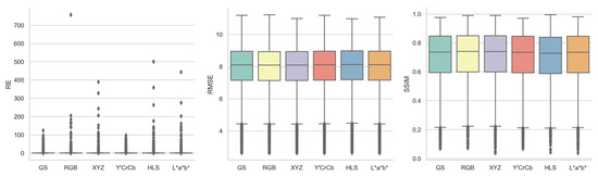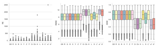 Boxplots of reprojection error (RE), root mean square error (RMSE), and structural similarity index measure (SSIM) achieved by each color space for all image registrations.