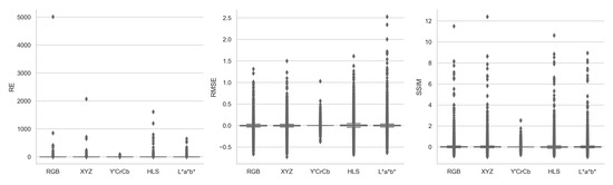 Figure 6, supplemented by Table A3, shows the boxplots of the registration quality relative changes achieved by each color space over grayscale, when their raw image pairs, feature detectors, and feature descriptors were identical. Generally, based on the median values of the distributions, no color space was able to improve RE over grayscale, likely for the reason mentioned above. However, again, RGB and XYZ both were able to improve RMSE and SSIM over grayscale marginally by 0.05% and 0.1%, indicating an expected image registration quality benefit when switching from grayscale to RGB or XYZ as input image channels. Overall Y′CrCb, as well as L*a*b* to a lesser degree, achieved an almost identical performance to grayscale with 0 or near 0 RE, RMSE, and SSIM relative changes. HLS again showed a consistently lower performance than grayscale, with median 10.57% RE increase, 0.09% RMSE increase, and 0.25% SSIM decrease.