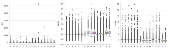 Figure 8, supplemented by Table A5, shows the boxplots of the registration quality relative changes achieved by each color channel over grayscale, when their raw image pairs, feature detectors, and feature descriptors were identical. Based on the median values of the distributions, X, Cr, Cb, a*, and b* were able to achieve lower REs than grayscale, with a 0.43% to 54.24% reduction. L* was the only color channel that attained superior RMSE and SSIM to grayscale, with a marginal 0.01% improvement for both metrics. Cr, Cb, H, S, a*, and b* again showed substantially inferior performance to grayscale according to RMSE and SSIM, with an increase of 2.33% to 16.11% for RMSE and a decrease of 6.77% to 33.28% for SSIM.