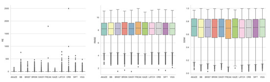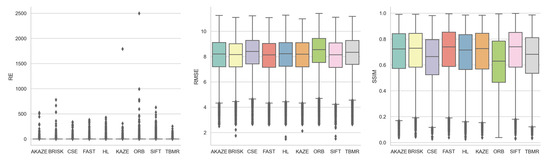 Boxplots of RE, RMSE, and SSIM achieved by each feature descriptor for all image registrations.