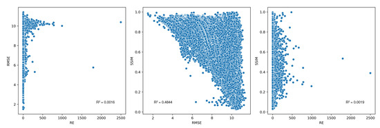 Figure 11 shows the scatter plots between the three registration quality metrics of all the image registrations. RMSE and SSIM were poorly correlated with RE, with coefficients of determination (R2s) of merely 0.0016 and 0.0019, respectively. This once again suggested the downside of RE as an image registration quality metric, potentially being extremely large for inaccurate registrations, unlike RMSE and SSIM, whose values fluctuated with narrow ranges. Additionally, as mentioned before, low REs could be simply the result of low matched feature numbers and did not guarantee accurate image registrations. RMSE and SSIM were better correlated, demonstrating a general negative correlation with a 0.4844 R2. Under the context of the study, which employed the unimodal dataset UDIS-D, RMSE seemed to be a superior and more reliable metric than SSIM. When RMSEs were low, such as being near 2, the corresponding SSIMs were also high, such as being near 1. However, when SSIMs were high, such as being near 1, the corresponding RMSEs distributed over the entire data range, such as being anywhere in between 2 and 11. In that regard, high-quality registrations identified through their RMSEs would likely also have high SSIMs, while high-quality registrations identified through their SSIMs would not necessarily have low RMSEs. Nevertheless, in terms of multimodal image registrations where image pixel values differ significantly, such as registrations between magnetic resonance imaging (MRI), computed tomography (CT), single-photon emission computed tomography (SPECT), positron emission tomography (PET), and ultrasound (US) images [72,73,74], or between optical, infrared, SAR, depth, map, day, and night images [75,76,77], SSIM might provide an advantage over RMSE to better quantify the similarity between registered target and source images.