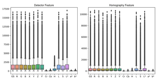 Figure 13, supplemented by Table A8, shows the distributions of the initial feature numbers in the target and source images detected by the feature detectors, as well as the inlier matched feature numbers in the target or source images after RANSAC used for homography estimation, achieved by each color channel for all the image registrations. Based on the distribution median values, as expected, Cr, Cb, a*, and b* had very low numbers of initial detectable features and final inlier features, with 24 to 31 detector features and 6 to 7 homography features. H and S also had considerably lower features than the most color channels, with 390 and 575 detector features and 10 and 53 homography features. From the most to the least, the rest of the color channels ranked as Z, L*, R, G, Y, Y′, grayscale, L, B, and X, with 399 to 449 detector features, and L*, G/Y/Y′/grayscale, Z/R, L, X, and B, with 144 to 162 homography features. As the best performing color channel in terms of registration quality, L* also ranked at the top in terms of feature numbers with the second-most initial detectable features and the most final inlier features. On the other hand, Cr, Cb, H, S, a*, and b* not only attained the lowest registration quality, but also had the lowest detector and homography features. This observation indicated the potential positive association between image feature number and image registration quality. In that sense, artificial intelligence-based image contrast enhancement and resolution upscaling might be a future research direction for improving image registration accuracy.