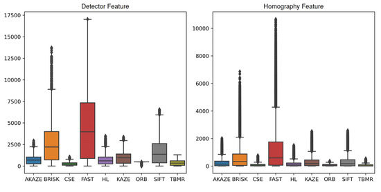 Boxplots of initial detector feature numbers and final homography feature numbers achieved by each feature detector for all image registrations.