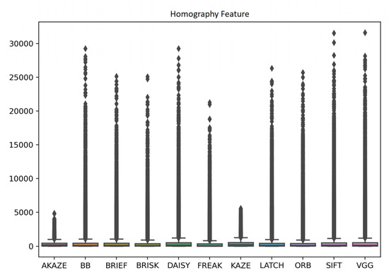 Boxplots of initial detector feature numbers and final homography feature numbers achieved by each feature descriptor for all image registrations.