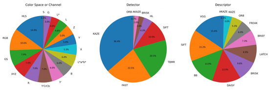 Composition pie charts of the 302 color space or channel, feature detector, and feature descriptor combinations that registered the entire dataset without failure.