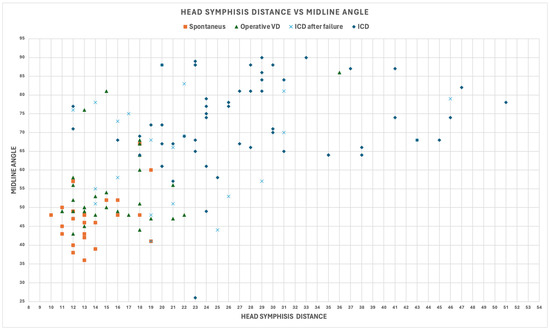 The outcomes of delivery were the following: 56 intrapartum cesarean deliveries (ICDs), 22 intrapartum cesarean deliveries after failure (ICDs after failure), 31 operative vaginal deliveries (OVDs), and 26 spontaneous deliveries (Figure 1), highlighting the moderate degree of Pearson’s correlation between the MLA and HSD due to a visible discrete correlation for spontaneous deliveries, a poor degree of correlation for all 78 ICDs, and also a large region of the plane in which there were only ICDs.