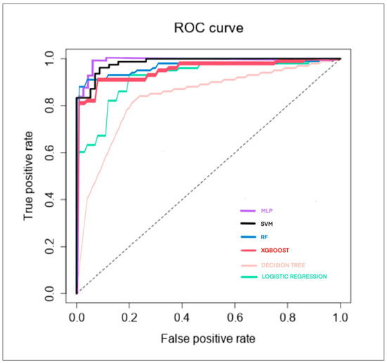 The best performer was MLP, with the following outcomes: accuracy: 0.97, AUC: 0.993, and precision: 0.9625, followed by random forest, with the following outcomes: accuracy: 0.933, AUC: 0.97, and precision: 0.9615, and SVM, with the following outcomes: accuracy: 0.933, AUC: 0.98, and precision: 0.9157. The results for XGBoost (accuracy: 0.896, AUC: 0.96, precision: 0.9358), logistic regression (accuracy: 0.844, AUC: 0.92, precision: 0.8718), and decision tree (accuracy: 0.837, AUC: 0.84, precision: 0.8462) were less exciting. Other performance parameters for each algorithm are shown in Table 2.