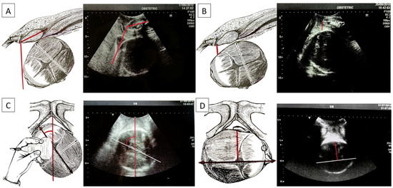 (A) Angle of progression (AoP): the drawing on the right and the US photo on the left show the AoP (red line) with the fetal head in the occiput anterior position; (B) fetal head–symphysis distance (HSD): the drawing on the right and the US photo on the left show the HSD (red line) with the fetal head in the occiput anterior position; (C) midline angle (MLA): the drawing on the right and the US photo on the left shows the MLA with the fetal head in the left occiput posterior position (white/black line: midline, the echogenic line between the two cerebral hemispheres; red line: anteroposterior diameter of the pubis). Longitudinal translabial sonography detected the MLA; (D) asynclitism degree (AD): the drawing on the right and the US photo on the left show the AD with the fetal head in the right occiput posterior position with anterior asynclitism (white/black line: midline, the echogenic line between the two cerebral hemispheres; red line: anterior asynclitism degree, perpendicular to the white/black line).