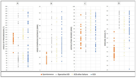The values of the four geometric parameters, AoP, HSD, MLA, and AD, measured at the same time for the 135 cases of the patients involved in this study and grouped by delivery outcome. (A) Angle of progression (AoP), values between min 72° and max 192°. (B) Fetal head–symphysis distance (HSD), values between min 10 mm and max 51 mm. (C) Asynclitism degree (AD), values between min 4 mm and max 95 mm. (D) Midline angle (MLA): values between min 26° and max 90°.