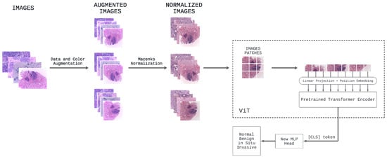 Consequently, all the breast cancer histology images, which now create a larger dataset, are used to fine-tune the original ViT model [3] pretrained on ImageNet-21k, namely google/vit-base-patch16-224-in21k. In this specific task with this pretrained ViT based on the original one, the process of fine-tuning enables leveraging the knowledge learned from a large dataset (ImageNet-21k) to improve performance on a specific task (the classification of breast cancer images) using a smaller dataset (the BACH dataset with data and color augmentations).