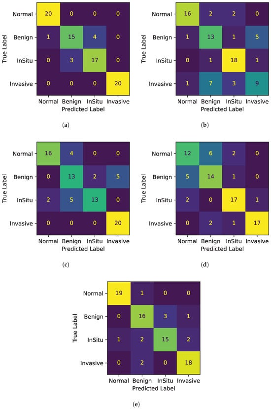 Figure 4. Confusion matrices for all 5 folds. (a) Confusion Matrix Fold 1. (b) Confusion Matrix Fold 2. (c) Confusion Matrix Fold 3. (d) Confusion Matrix Fold 4. (e) Confusion Matrix Fold 5. - Precision: The model’s precision is generally quite high, with the normal class showing the highest mean precision at 0.86. However, the invasive class again shows a high variation in precision across folds at 0.15.