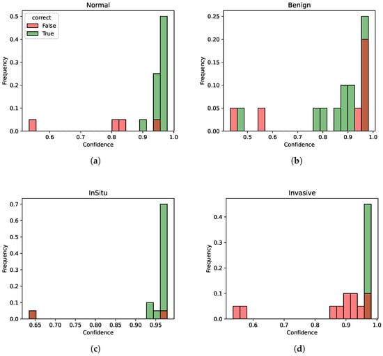 Overall, Fold 1 and Fold 5 perform better than the others as we can see by the results of the different metrics. In particular, we investigate the fold with the least performance to highlight model weaknesses, that is, number 2. In Figure 5, the distribution of the predicted probabilities for each class of Fold 2 is presented, divided between correct and incorrect predictions. Thus, each figure shows the probability distribution of the normal, benign, in situ, and invasive class. For each class, both correctly and incorrectly predicted samples for the current class are calculated. Then, two histograms are created: one for correct predictions with the color green and one for incorrect predictions with the color red. Both histograms show the distribution of the predicted probabilities for the current class.