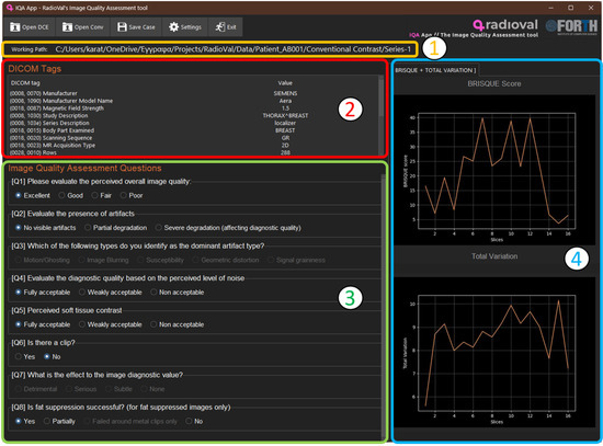 Windowed application showing the distinct compartments: 1: working path, 2: DICOM tags extracted from the sequence headers, 3: questionnaire to be addressed by the expert (only this part is mandatory for completing the IQA evaluation), 4: objective quality metrics for the total number of slices in the selected sequence. The windowed application does not support ROI-based SNR and CNR measurements.