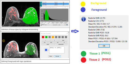 Workflow for measurement of ROI-based metrics (segmentation based on histogram sub-sections, ROI logical operations for defining the foreground ROI) related to tissue-specific or local SNR and CNR.