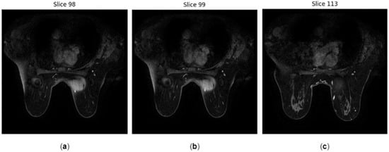 Images of different slices of the first post-contrast phase of a patient with ID Breast_MRI_056: (a) Slice 98; (b) Slice 99; (c) Slice 113. Comparison among different slice locations serves to simulate patient movement in the z-axis during dynamic acquisitions for performing feasibility testing of in-plane motion detection.