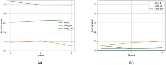 No-Reference metrics for three different slices of a patient with ID Breast_MRI_056 in three post-contrast phases: (a) BRISQUE score for each slice in each post-contrast phase; (b) total variation for each slice in each post-contrast phase.
