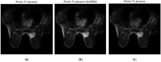 Images of a patient with ID Breast_MRI_056: (a) Slice 98 of the first post-contrast phase; (b) Slice 98 of the first post-contrast phase after applying a Gaussian blurring filter with a kernel size equal to 7 × 7; (c) Slice 98 of the second post-contrast phase. Applying blurring serves to simulate patient movement in the x-y plane for performing feasibility testing of through-plane motion detection.