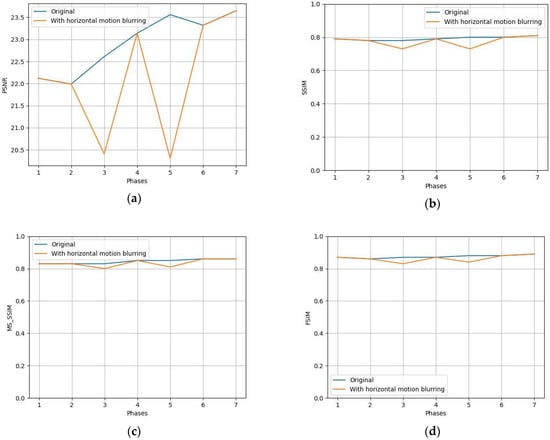 Feasibility testing of identifying degraded time points inside a time-series dynamic acquisition. Full-Reference metrics were calculated for all time phases for the original dataset, as well as the original dataset after applying blurring filters in time phases 3 and 5 out of 7. (a) Peak Signal-to-Noise Ratio (PSNR); (b) Structural Similarity Index Measure (SSIM); (c) Multi-Scale Structural Similarity Index Measure (MS-SSIM); (d) Feature Similarity Index Measure (FSIM).