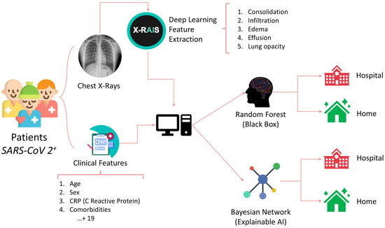 Figure 1. Graphical representation of patient’s medical data gathered and deep learning information used to estimate hospitalization or at-home management. Data are processed by Random Forest and Bayesian Network algorithms, determining the appropriate treatment option.