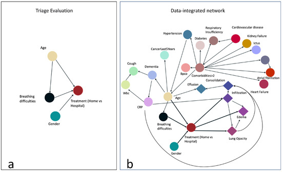 Figure 2. The left graph (a) includes relationships between some variables that represent the reasoning process of clinicians during emergency triage. The right graph (b) is the result of enriching it through the hill climbing search algorithm with the remaining collected variables.