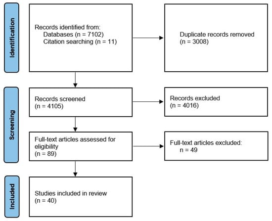 The initial search yielded 7113 articles, which were processed through abstract screening, from which 89 articles were selected for full text reading. Finally, 40 articles fulfilled the inclusion and exclusion criteria after the full text review.