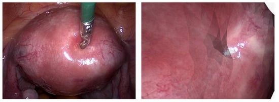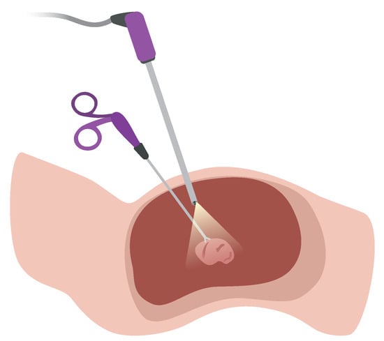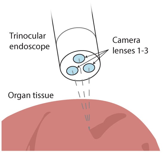 In recent decades, Minimally Invasive Surgery (MIS) has demonstrated superior patient recovery and surgical outcomes with smaller incisions, less pain, lower risk of infection, reduced blood loss, shorter hospital stays, and less scarring than traditional surgery. In the context of laparoscopy, which is depicted in Figure 1, substantial progress was made concerning image quality, in vivo imaging techniques such as narrow-band, intra-operative tools in robotics, 3D position tracking, 3D reconstruction of surgical scenes, and many more [,]. Despite this progress, a well-experienced surgeon is still needed to carry out minimally-invasive interventions due to a multitude of reasons: a small field of view, a restricted range of motion, a shadowless illumination of the surgical area, and a lack of depth perception, to name a few. But even for trained professionals, it is hard to accurately survey the correct dimensions of anatomical landmarks [].