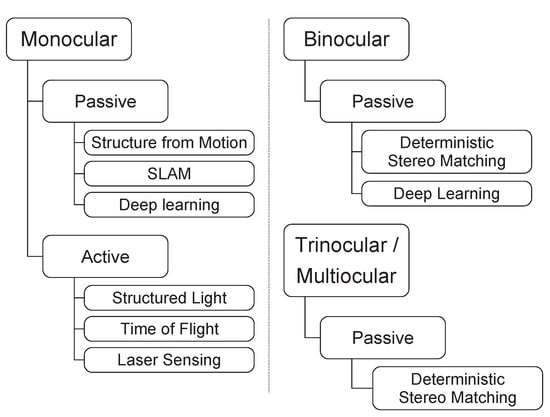 The following categorizations are carried out according to the designations provided by the individual authors. This is also the case for Structure from Motion (SfM) and Simultaneous Localization and Mapping (SLAM), which could be merged with regard to the real-time criterion. A summary of passive and active real-time monocular methods evaluated against self-developed datasets can be found in Table 2.