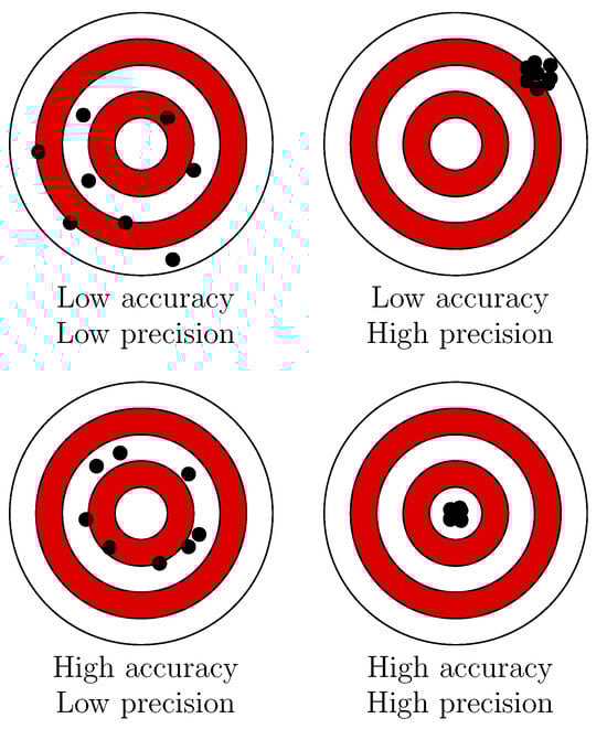It is essential to differentiate between accuracy and precision, as they are sometimes incorrectly used interchangeably. Accuracy denotes how well the mean value of multiple measurements fits the expected value of the measured quantity. Precision describes how far the measurements are scattered from their mean value on average. For example, when shooting darts at a target, the bullseye is the expected value of the observed throws. The closer the average of all hits is to the bullseye, the higher the accuracy. The closer the hits are to each other, regardless of the location, the higher the precision. This matter is illustrated in Figure 3.