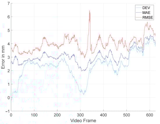where  is the pixel at position p in the resulting disparity map of an arbitrary algorithm,  is the pixel at position p in the ground truth disparity map, and n is the number of pixels in each disparity map. The MAE is a measure of the average magnitude of errors in a test set, without considering their direction. It describes the equally weighted average over all absolute differences between the expected result and the actual result. This unit of measure is used, for example, when comparing different algorithms against the Stereo Correspondence and Reconstruction of Endoscopic Data (SCARED) dataset by Allan et al. [].