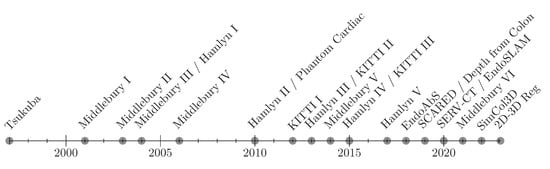 For non-medical stereo applications, the Middlebury dataset (MD) and the Karlsruhe Institute of Technology and Toyota Technological Institute (KITTI) datasets are the most popular. The Middlebury Dataset is a widely recognized benchmark for evaluating computer vision algorithms, providing datasets for stereo vision, optical flow, and 3D reconstruction. It consists of six different datasets, 2001 [], 2003 [], 2005 [,], 2006 [,], 2014 [], and 2021 []. The KITTI dataset by Menze and Geiger  [] is mainly focused on optical flow applications using their autonomous driving platform AnnieWAY []. The latest version is from 2015 and updates the 2012 benchmarks for stereo and optical flow applications while adding a benchmark for scene flow applications [].