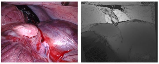The real-time capability of 3D reconstruction algorithms is essential for surgeries where the physician can be assisted during an operation. In this case, the algorithm has to provide depth information promptly. If the already present video feed during an operation can be used to analyze the scene in real-time and provide depth information without hindering the physician, the optional depth information can only be beneficial. Additional assistance, e.g., by offering navigational aid or removing surgical instruments from the surgeon’s view is also conceivable, although instrument-tissue interaction makes gathering depth information in these areas challenging []. Moreover, navigation and instrument segmentation or removal are not in the scope of this contribution.