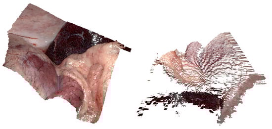 The Stereo-Endoscopic Reconstruction Validation dataset based on cone-beam CT (SERV-CT) dataset, similarly to the SCARED dataset, aims to provide a stereo-matching dataset for the challenges encountered during MIS. It was developed by Edwards et al. [] in 2020 to provide a freely available alternative to SCARED. The SERV-CT consists of two sub-datasets, containing eight calibrated image pairs of one of two porcine cadavers together with ground truth data. The images are recorded with a first-generation da Vinci surgical robot by Intuitive Surgical, at a resolution of  pixels. The CT ground truth data are provided by an O-arm™ Surgical Imaging System by Medtronic. An interventional scanner on the inside of the system generates 3D reconstructions equivalent to CT reconstructed from a rotating X-ray set enclosed within a circular casing. In the second sub-dataset, the authors provide, in addition to the CT data, an RGB surface reconstruction created by the Creaform Go SCAN 20 hand-held structured light scanner. This RGB data allows algorithms to align smooth and featureless surfaces better. To evaluate 3D reconstruction algorithms the SERV-CT provides a toolkit that calculates the RMSE and the Bad3 error. The dataset provides scenes with a range of different tissue types, including smooth surfaces with specular reflection properties, as well as depth variations and occluded surfaces.
