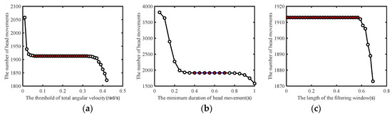 Based on the head movement template in Figure 2, it can be observed that head movements generally exhibit a back-and-forth motion, which is manifested as two peaks in the angular velocity angmin. In order to correctly identify these two peaks, it is necessary to determine the threshold of the angular velocity. At a minimum duration of head movement tmin = 0.5 s, the threshold of the angular velocity was tested in the range of [0.01, 0.42] with an increment of 0.01, and it was found that correct endpoint detection can be achieved within the range of [0.06, 0.32] of the angular velocity; hence, angmin = 0.2 was selected, as shown in Figure 3a. Subsequently, at angmin = 0.2 rad/s, the minimum duration of head movement was tested in the range of [0.05, 1] with an increment of 0.05, and it was found that correct endpoint detection can be achieved within the range of [0.4, 0.7]; hence, tmin = 0.6 s was selected, as shown in Figure 3b. Finally, the influence of the median filtering length on the results was examined, taking angmin = 0.2 rad/s and tmin = 0.6 s, resulting in twin = 0.3 s, as shown in Figure 3c.
