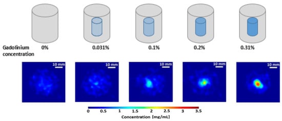 Gadolinium (Gd) at varying concentrations, derived from Gadoteric acid (C16H25GdN4O8), was utilized as the contrast agent. The small-animal-sized surrogate phantoms (mimicking a size-scale on the order of, e.g., mice) consisted of water-filled hexagonal borosilicate glass containers with a maximum diameter of 50 mm and a height of 60 mm. To accommodate 3D breast cancer models immersed in the cell-culture growth medium, the phantoms were chosen with a diameter exceeding that of a typical mouse’s torso (i.e., about 20–25 mm) The Gd–filled polypropylene microcentrifuge tubes, 8 mm in diameter, were embedded inside these water-filled phantoms. Gadolinium (Gd) was used as a contrast agent for various reasons. High atomic number (high-Z) elements, such as Gd (K-alpha emission around 43 keV), exhibit a relatively weaker energy-dependent photon attenuation compared to lower atomic number (low-Z) elements, e.g., iodine (K-alpha emission around 28.4 keV) at this size-scale. Additionally, cadmium telluride (CdTe) pixel detectors were used for the XFCT imaging that exhibits high sensor-intrinsic X-ray fluorescence (i.e., K-shell emission from Cd and Te), making the low energy range (roughly, 19–32 keV) unusable. Consequently, high-Z contrast agents become more favorable at this scale, making Gd a better choice over low-Z elements. These phantoms were used in the previous study to investigate the suitability and feasibility of cone-beam XFCT for both preclinical in vivo imaging of small animals and in vitro surrogate investigations with non-destructive analysis of biological samples []. The Gd tubes had concentrations ranging from 0 to 3.1 mg/mL (0, 0.031%, 0.1%, 0.2%, and 0.31% Gd by weight (wt.%), see Figure 1). The first row of Figure 1 shows a representative illustration of the varying Gd concentration, and the second row shows an example of the XFCT scan in the presence of different Gd concentrations.