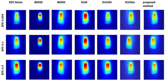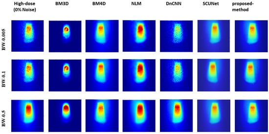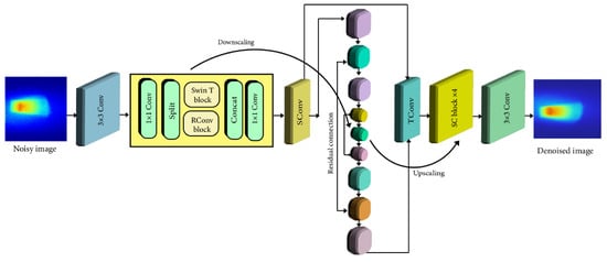 Recently, deep learning denoising methods have been widely used in the field of biomedical imaging and image processing [,,,]. The convolutional neural network (CNN) architecture can extract features from low to high levels, resulting in better identification and understanding of patterns []. The methods show a high performance of image-to-image translation issues [,]. For example, achieving a high-quality (high-dose) image from a low-dose image by removing image noise []. In contrast to the assumption made in non-blind image denoising, which presupposes knowledge of the image noise type and level, blind denoising addresses scenarios in which either the noise level, the specific noise type, or both are unknown. Zhang et al. [] show that a deep model is capable of managing Gaussian denoising across different noise levels. Meanwhile, Chen et al. [] suggest employing generative adversarial networks (GAN) for noise modeling from clean images. The generated noise is then used to create paired training data for subsequent training purposes. Guo et al. [] introduce a convolutional blind denoising network, which incorporates a subnetwork for estimating noise. They further suggest training the model using both a practical noise model and pairs of real-world noisy–clean images. Krull et al. [] introduce a method using variational inference for blind image denoising. This method unifies both noise estimation and image denoising within a Bayesian framework. Sun and Tappen [] introduce a non-local deep learning approach that combines the benefits of block matching and 3D filtering (BM3D) and non-local means (NLM). Furthermore, the conventional BM3D technique is expanded into a four-dimensional space (BM4D), leading to enhanced preservation of image edge and texture intricacies Zhang et al. [], Xu et al. []. Lefkimmiatis [] creates an unrolled network capable of executing non-local processing, leading to enhanced denoising outcomes. Liang et al. [] show improvement in peak signal-to-noise ratio (PSNR) performance achieved by a specific method, i.e., image restoration using the Swin transformer (SwinIR), compared to denoising convolutional neural network (DnCNN) on a benchmark dataset. Liu et al. [] employ a transformer-based method, the shifted window transformer (Swin), as the primary building block. They demonstrate that the Swin model exhibits improved performance when handling images with repetitive structures, verifying the effectiveness of the transformer in enabling non-local modeling capabilities []. A further study proposed a new blind denoising network architecture named Swin-Conv-UNet (SCUNet), applied it to a real image dataset, and designed it for improved practical usage and enhanced local and non-local modeling abilities [].