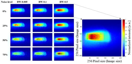 To achieve optimal denoising results, we initiated our model training by utilizing the official pre-trained weights of SCUNet. Subsequently, we fine-tuned the model on our specific dataset, enhancing its adaptability to our unique denoising requirements. During this training process, a compound loss function was employed to synergistically improve the overall performance of the model. Figure 4 shows examples of images in our dataset with varying noise levels and bin widths. In the first row, we present our original data with 100% of the initial number of photons. Subsequently, we reduce the number of photons by a factor of 25% in each following row, simultaneously increasing the sampling rate to 0.05, 0.1, and 0.5. In this figure, the highest quality image is the one with a noise level of 0% and maximum bin width (BW) of 0.5 (see first row and third column), and the lowest quality image is the one with a 75% noise level and bin width of 0.005. An enlarged image is shown in this figure for clarity, having an image size of 256 × 256 pixels.