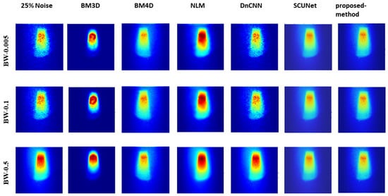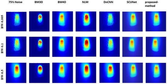 Figure 5, Figure 6, and Figure 7 show the predicted denoising qualitative results for various methods at noise levels of 25%, 50%, and 75%, respectively. These tables compare state-of-the-art techniques with our proposed model on our dataset. Results for the BM3D method are presented in the second row of each table. BM3D, a 3D block-matching algorithm primarily used for noise reduction in images, is an extension of the NLM methodology []. In the third column, the results for an enhanced version of MD3D are illustrated, which integrates a combination of BM4D within the 3D shearlet transform realm, alongside a generative adversarial network, for image denoising []. The fourth column displays the outcomes of the NLM method, which involves calculating the mean value for all pixels in the images, with weights assigned based on the similarity of each pixel to the target pixel []. Moving to the fifth column, we observe the results for the DnCNN []. This method aims to recover the clean image x from the noisy image , assuming v is additive white Gaussian noise (AWGN). The network can handle Gaussian denoising with an unknown noise level. In general, image denoising methods can be categorized into two major groups: model-based methods, like BM3D, which are flexible in handling denoising problems with various noise levels but are time-consuming and require complex priors, and discriminative learning-based methods, like DnCNN, developed to overcome these drawbacks. In the sixth column, we present the results for blind image denoising via the SCUNet method [], while existing methods rely on simple noise assumptions, such as AWGN, the SCUNet method is designed to address all unknown noise types that remained unsolved in previous methods. The last column shows the results of our method, which extends the performance of the SCUNet method. The qualitative results of the proposed model consistently yield superior visual outcomes across all different bin widths, while BM3D exhibits better visual results, it tends to produce smoother images, consequently removing important details. In contrast, the proposed method generates images that closely resemble the original (0% noise level) image. Conversely, DnCNN produces results that closely match images at the same noise level.