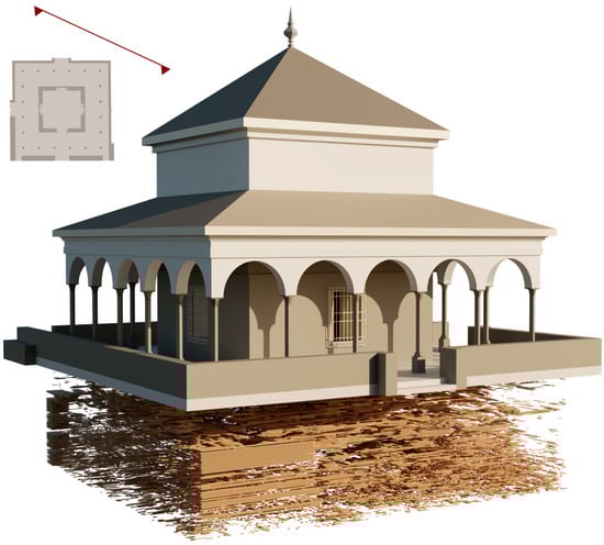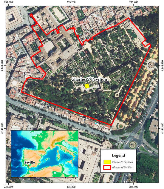 The city of Seville was the setting for one of the most important events in the personal biography of Emperor Charles V: his marriage to Princess Isabella of Portugal, which took place in the Alcazar on 11 March 1526. This marriage to his 23-year-old cousin, who could give him an heir, reconciled his economic needs as a Habsburg with the wishes of the Castilian Cortes of 1525 to Hispanicise the new monarch, who, born and educated abroad, appeared as an outsider in the eyes of his new Spanish subjects. In honour of the marriage of Emperor Charles V and Isabella of Portugal, a pavilion was built in the heart of the Alcazar []. The Pavilion of Charles V is an architectural jewel of Seville (Figure 1). Although its origins date back to the 12th century under Muslim rule, the marriage of Emperor Charles V and Isabella of Portugal led to its transformation into the Renaissance masterpiece we admire today. The Pavilion, ornamented with Genoese marble columns and intricate 16th century relief tiles (Figure 2), houses one of the most significant collections of Spanish Renaissance ceramics []. As a unique element of historical and architectural importance, it requires the application of advanced technologies for its conservation and understanding.