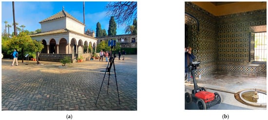 The Charles V Pavilion in the gardens of the Royal Alcazar of Seville with the utilised technology. (a) Exterior view with the 3DTLS. (b) Interior view with the GPR.