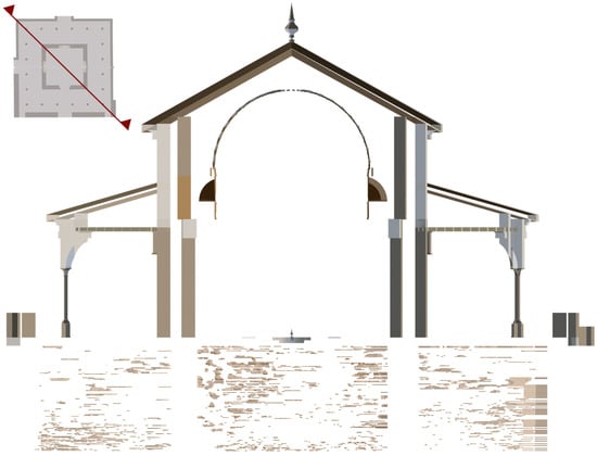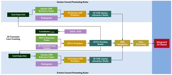 Through the synergy of 3D terrestrial laser scanner (3DTLS), global navigation satellite system (GNSS), and GPR [], a precise and detailed point cloud of the pavilion and its subsurface is generated. This not only helps with the creation of building information modelling (BIM) of the pavilion but also enables researchers to explore the pavilion from diverse perspectives, fostering comparative analyses with contemporaneous structures.