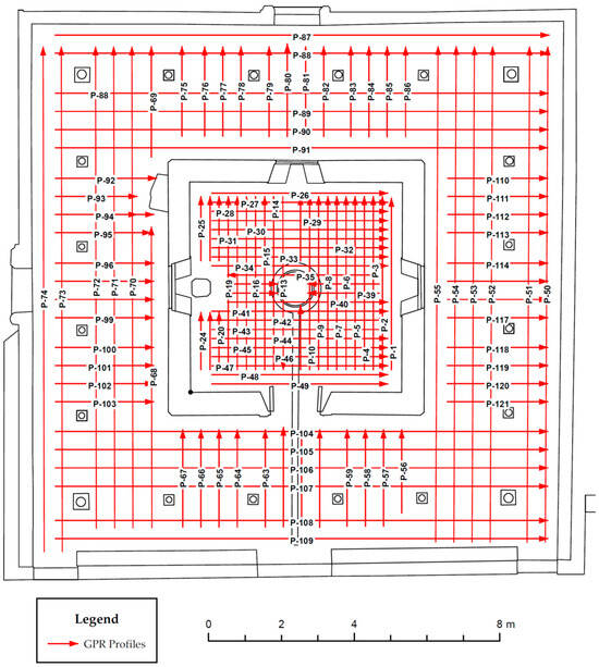 Before data collection, the survey area was systematically gridded each 0.5 m to help with systematic coverage and ensure uniform sampling of the subsurface (Figure 5). Transects were carefully planned based on the site’s historical significance, architectural layout, and suspected areas of interest identified through prior research and consultation with archaeological experts.