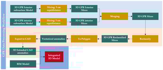 In the context of 3D GPR analysis, the acquired radargrams undergo a critical transformation process to help with integration into BIM workflows [,,] (Figure 6). In the workflow for integrating 3D GPR data into BIM environments, these sequential steps are undertaken:
