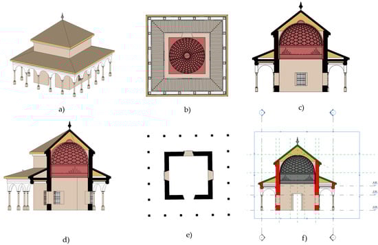Views of the Pavilion of Charles V BIM model: (a) 3D view, (b) bottom view, (c) orthographic section of the 3D model, (d) section of the 3D model, (e) plant plane, and (f) horizontal and vertical section positions.
