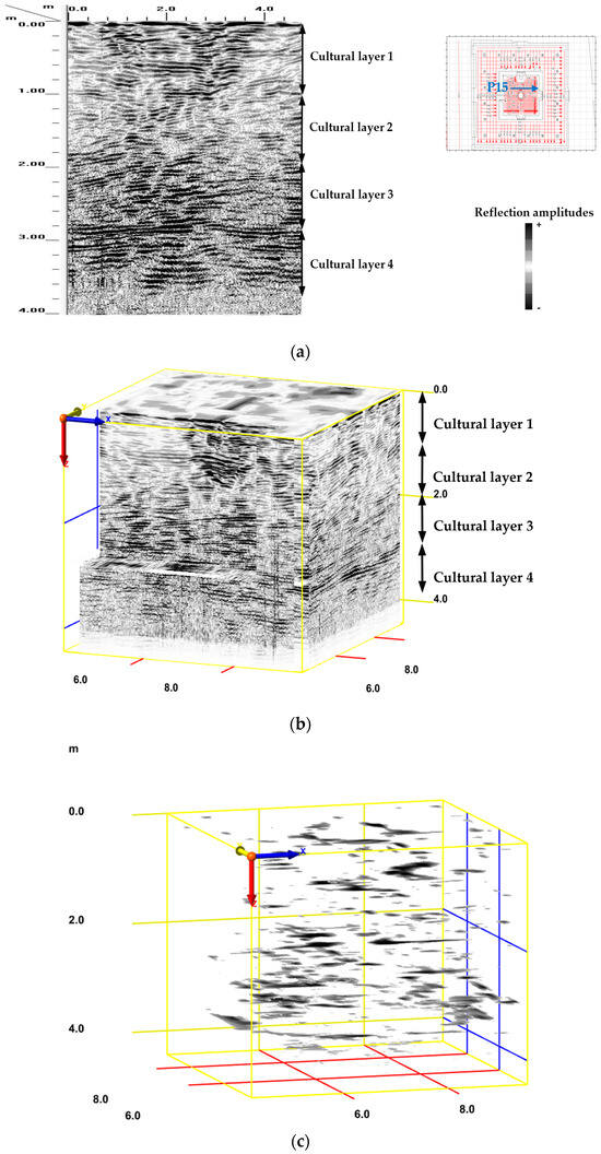 (a) P15 reflection profile and (b) 3D radar section images after processing the raw data, showing underground evidence of structures and cultural layers; their layer thicknesses are indicated by black arrows. (c) Isosurface image in the studied volume, showing the main anomalies (buried structures) detected and other reflection points coloured in grey-black.