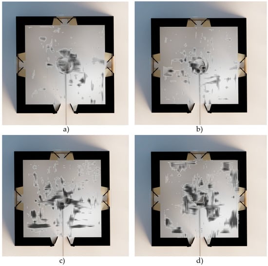 Examples of overlapping raster anomalies in the 3D model due to the different structures detected in each cultural layer: (a) 66 cm depth in cultural layer 1, (b) 133 cm depth in cultural layer 2, (c) 222 cm depth in cultural layer 3, and (d) 311 cm depth in cultural layer 4.